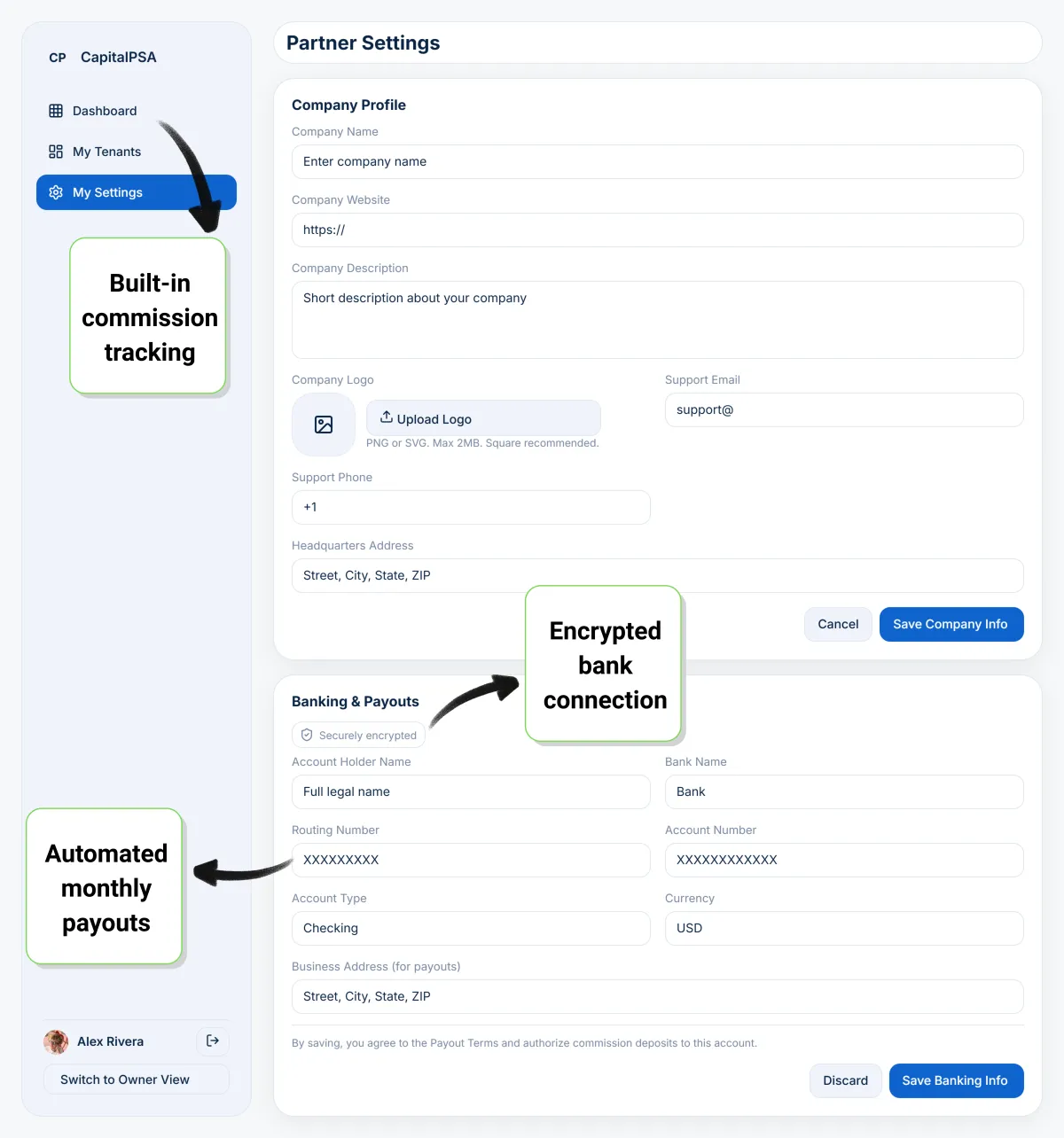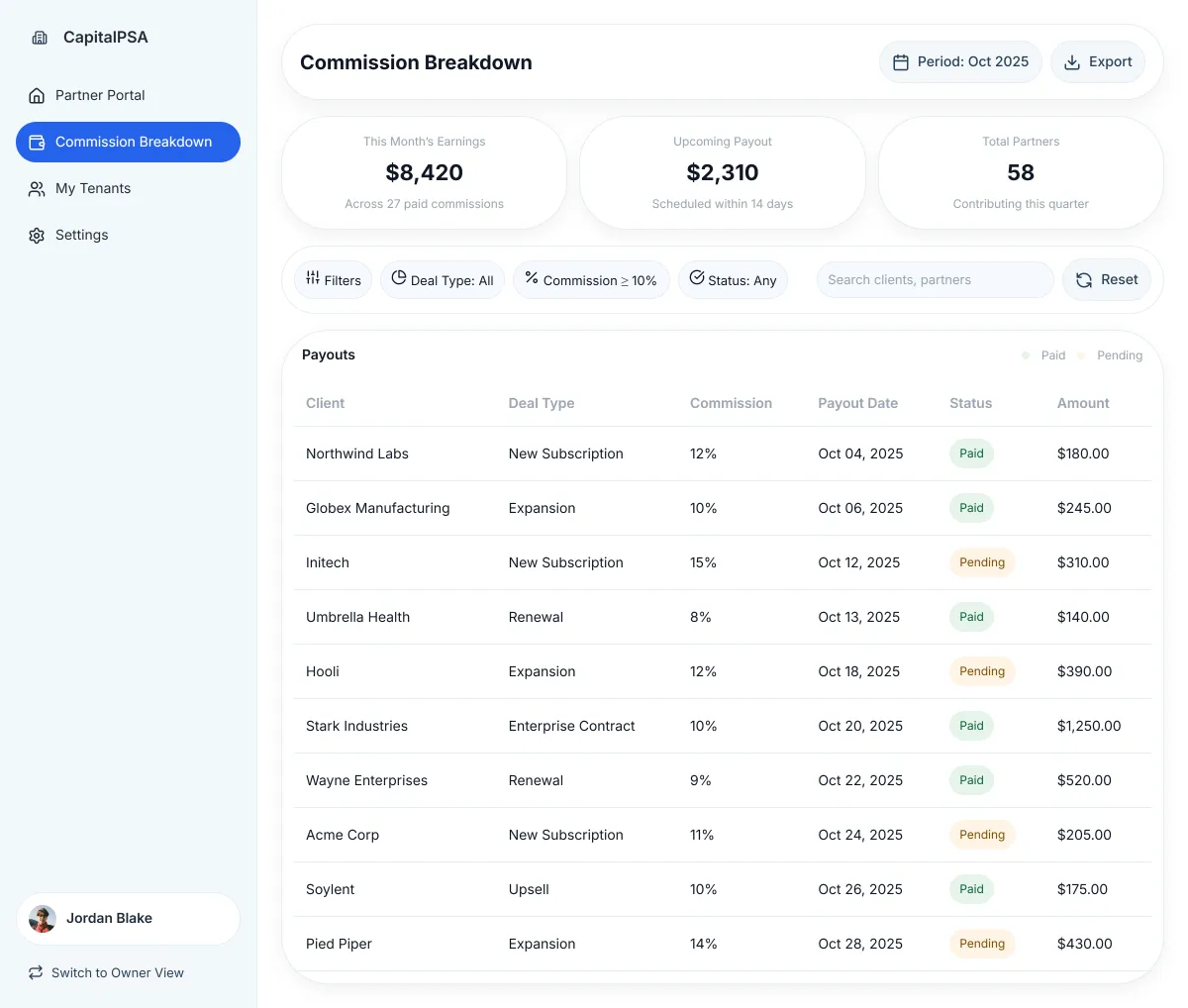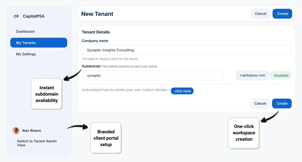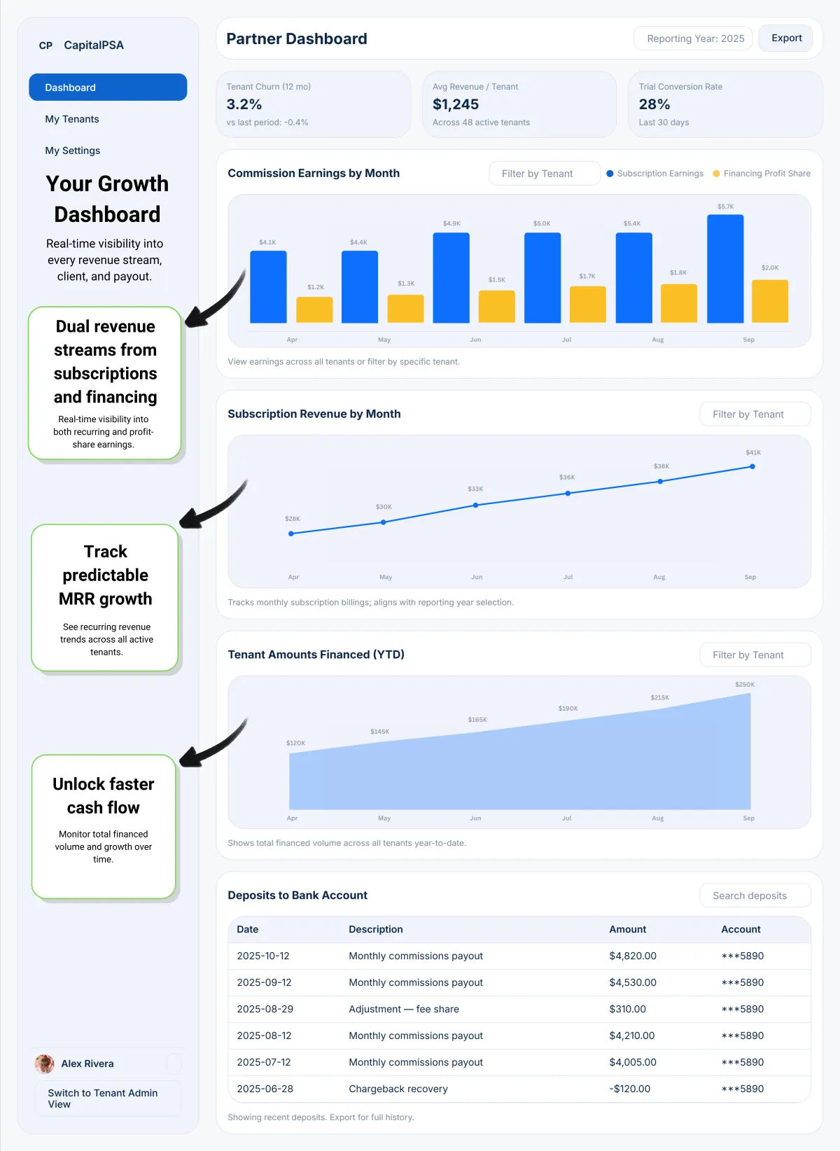 Deliver a white-labeled client experience with your logo, custom domain, and personalized dashboards — all powered by CapitalPSA.